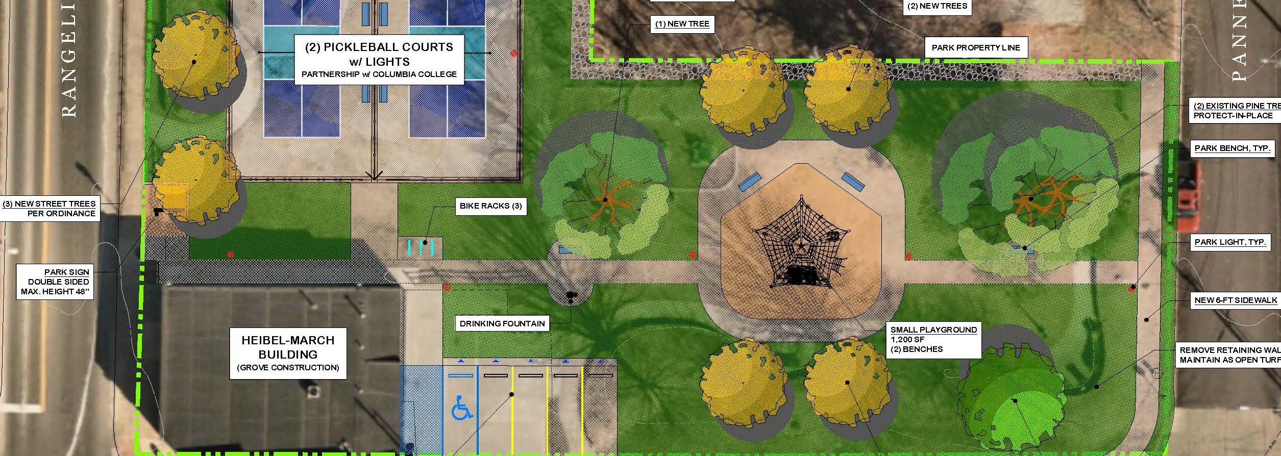 Proposed park improvements may include two new pickleball courts (in partnership with Columbia College), replacement of the playground, new walkways, landscaping and lighting.
