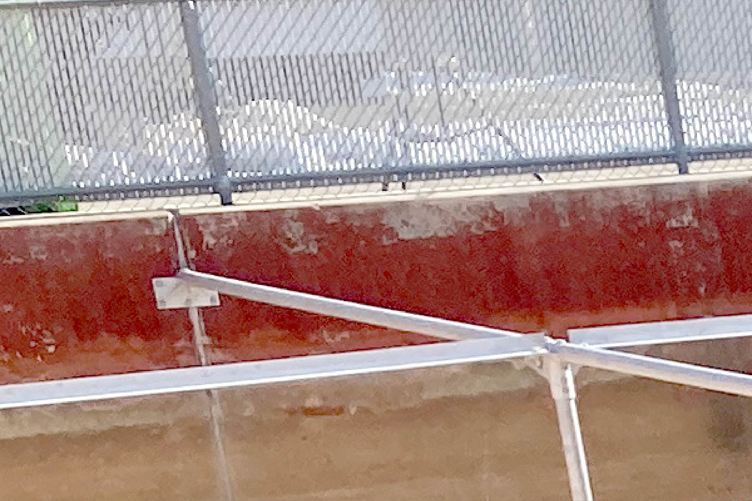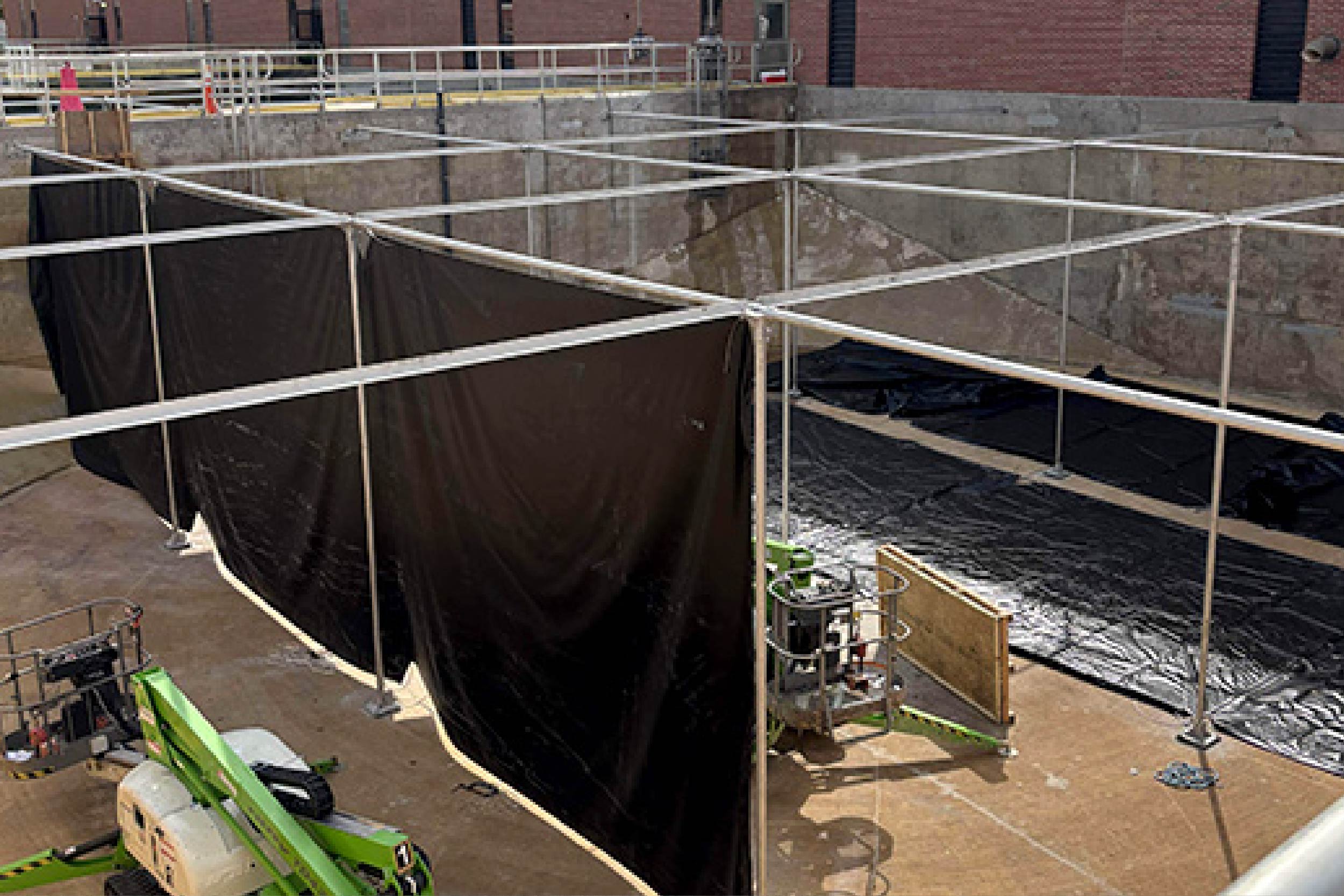 Crews began installing rods that will align the baffle curtain in Secondary Basin 3. The baffle curtain will be arranged similar to a queue for an amusement park ride. This slows the water flow, allowing more solids and sediments to settle at the bottom. Water is taken from the top to the filtration building and further treatment.