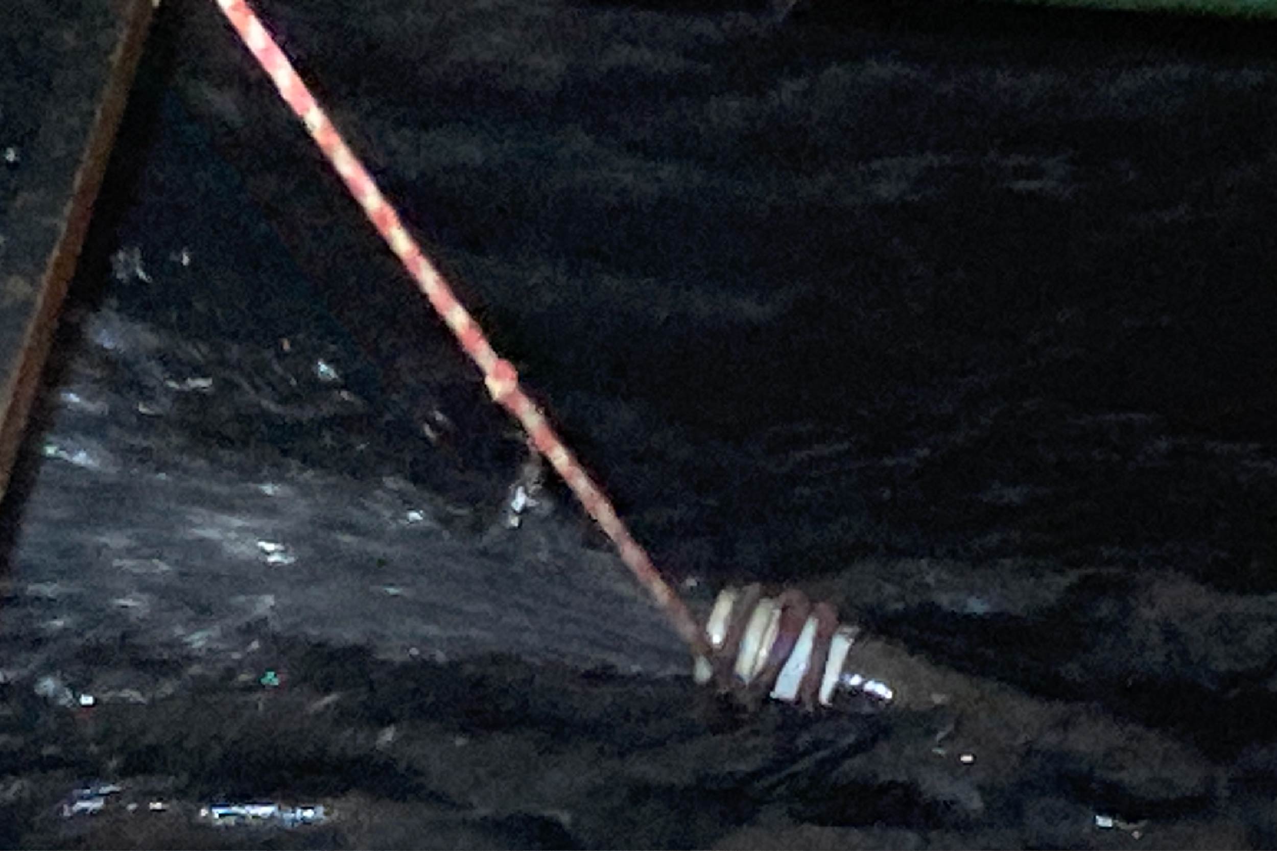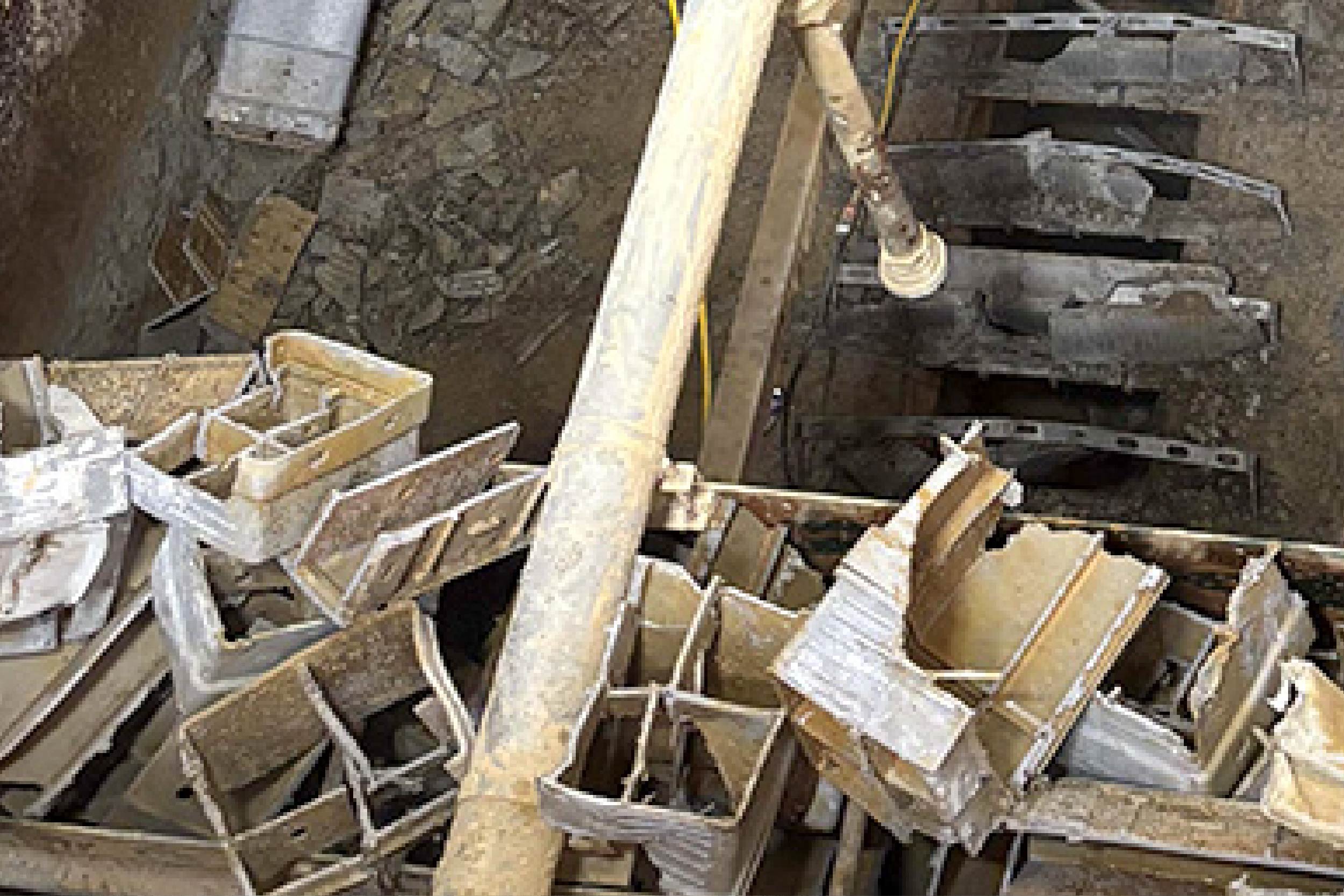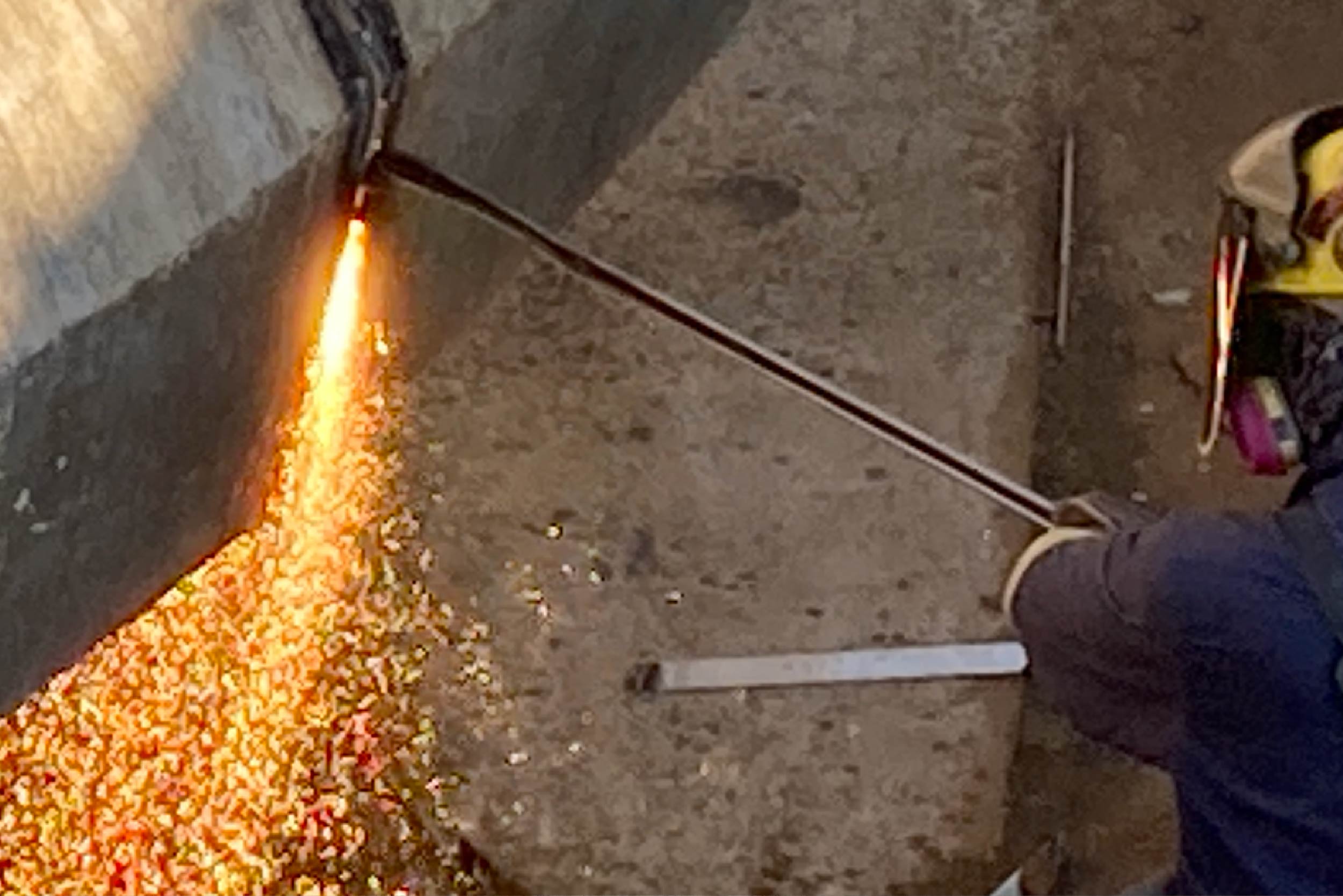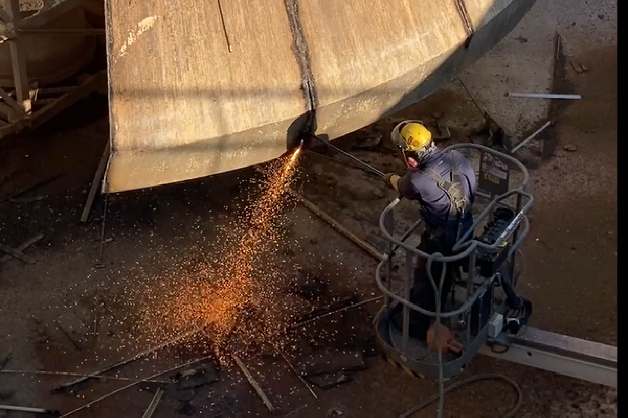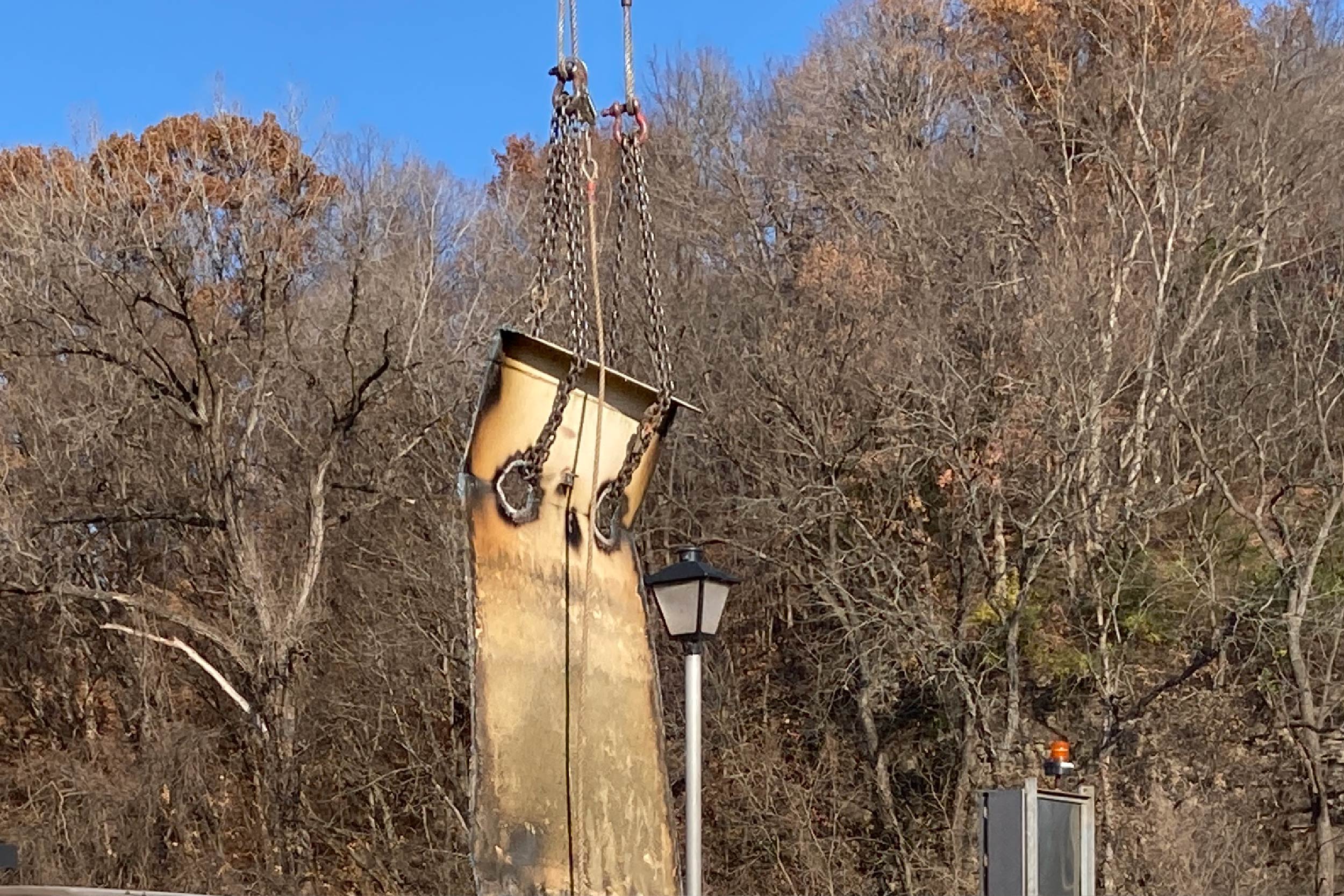 With blow torches in hand, crews sliced through the steel pieces of the cone. The pieces were then lifted out of the basin with a large crane.