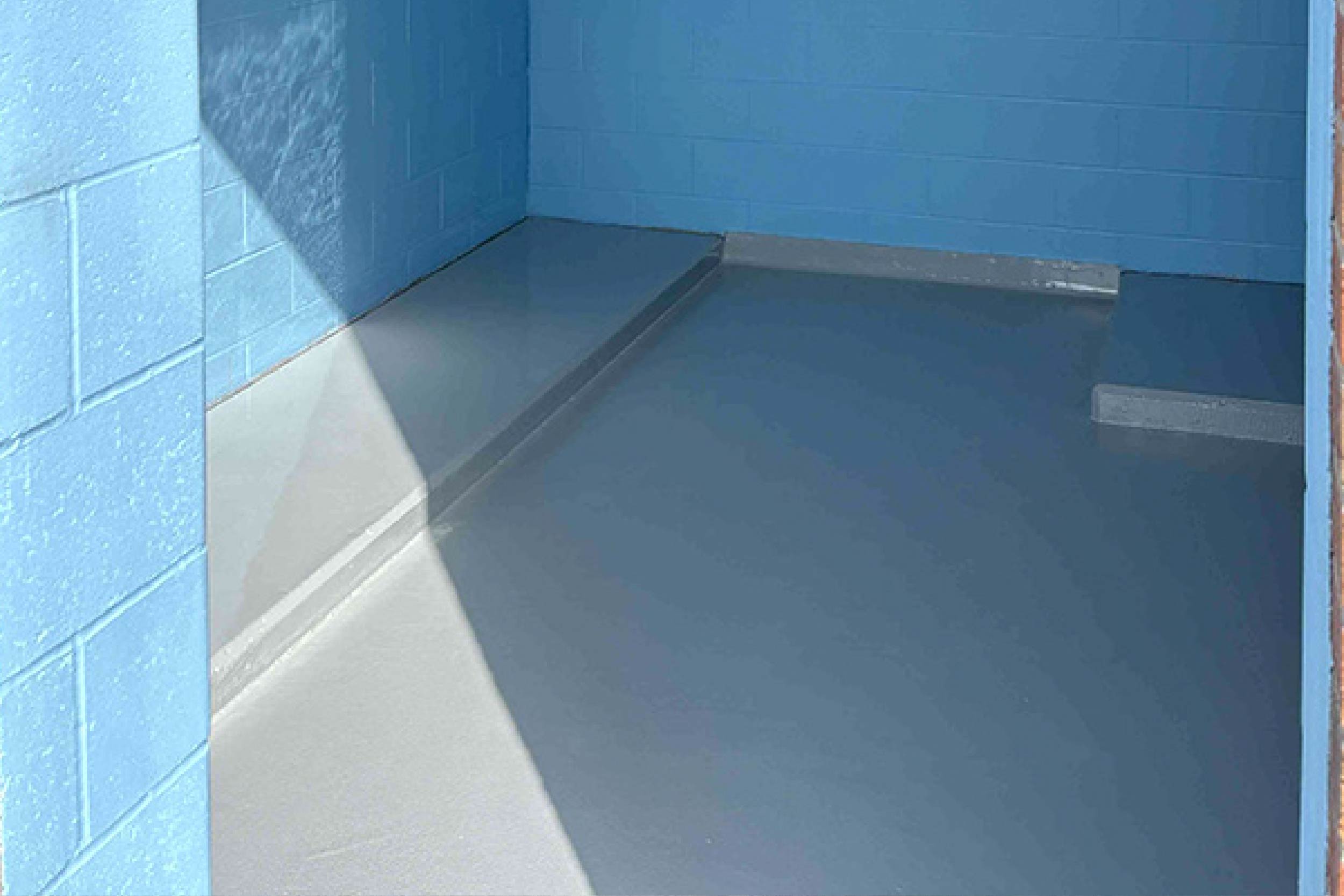 The center of Primary Basin 3 is being removed and a new floor will be poured. In the background, another worker has begun stripping the coating off the concrete.A worker pressure washes some of the coating off the wall in Secondary Basin 3.