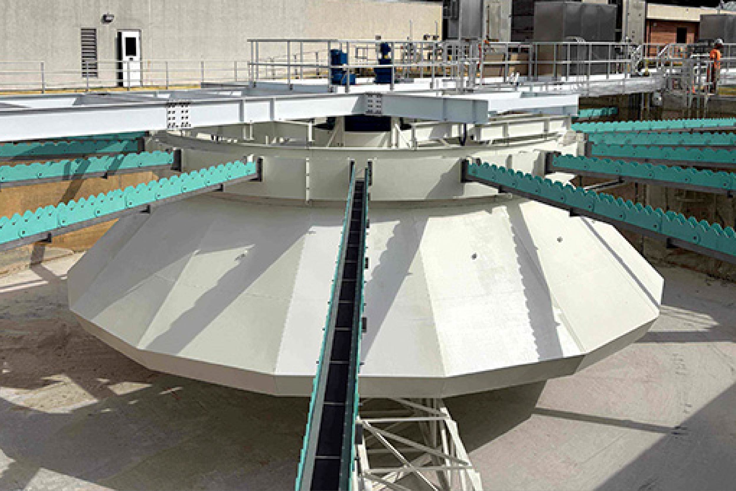 Primary Basin 3 has really started to come together. After the base was built, crews moved the spur gear into place and then capped it off with the drive assembly. The clarifier spins to remove suspended solids, and the sludge settles to the bottom, moving cleaner water to the secondary basin.