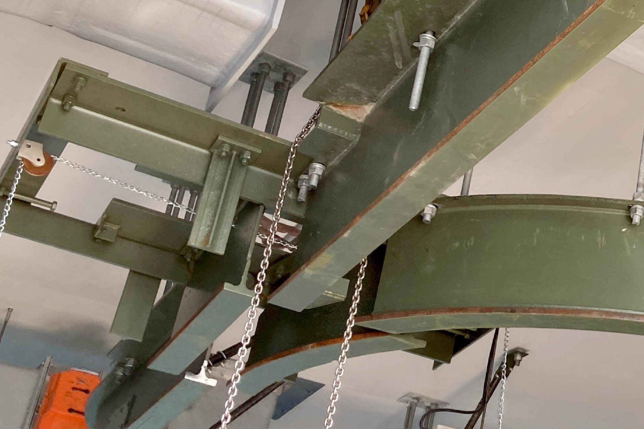 Once the drive assembly was completed, crews worked to install the bridge that spans Primary Basin 3. The team built the bridge and then moved it as a single piece over the basin. Precision was important. The bridge had to fit over the drive assembly and onto the brackets attached to the basin walls. A fraction of an inch out of place meant the bridge wouldn't fit.
