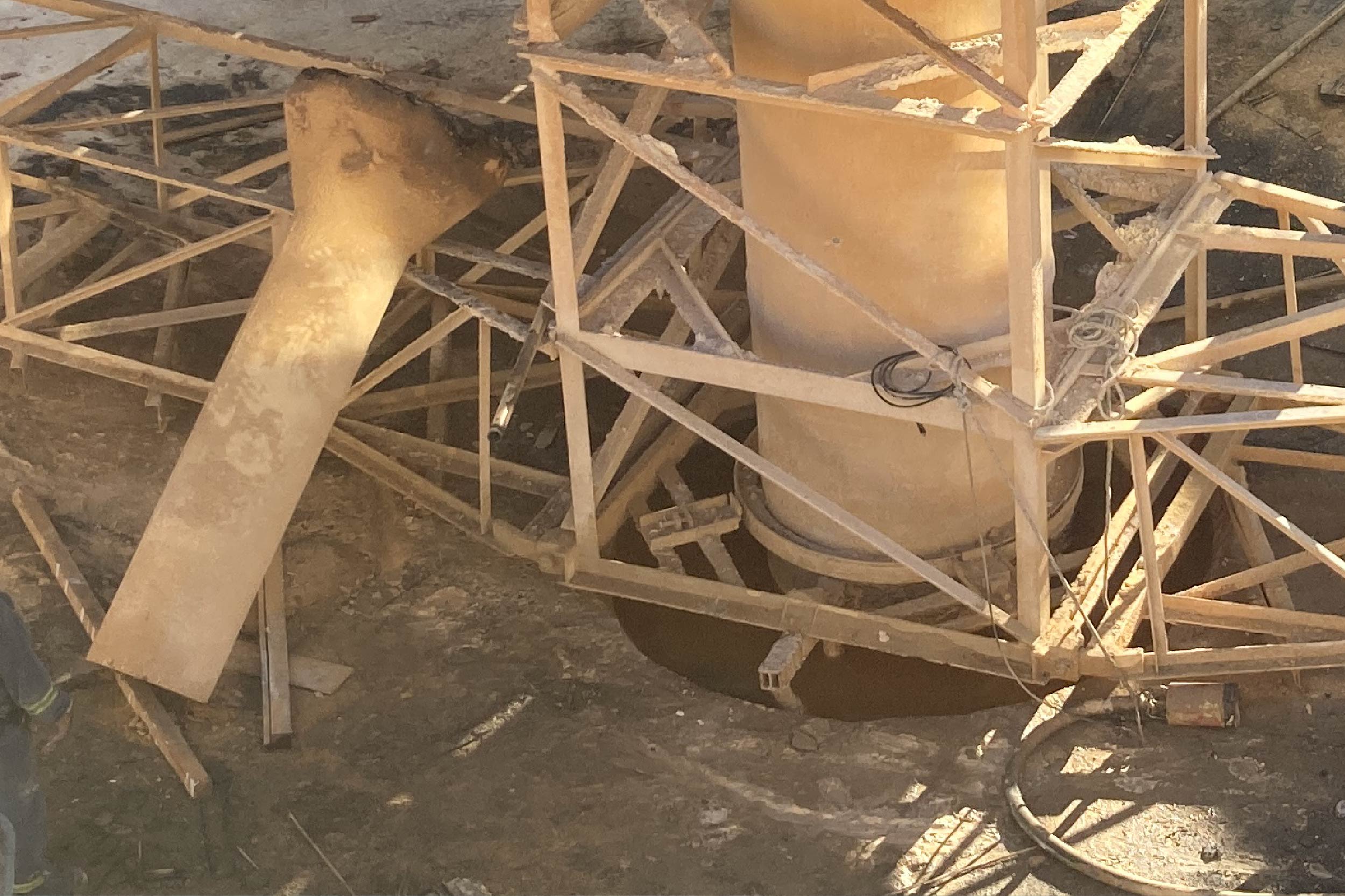 A jackhammer on the crane knocks down the walls of a lime silo.