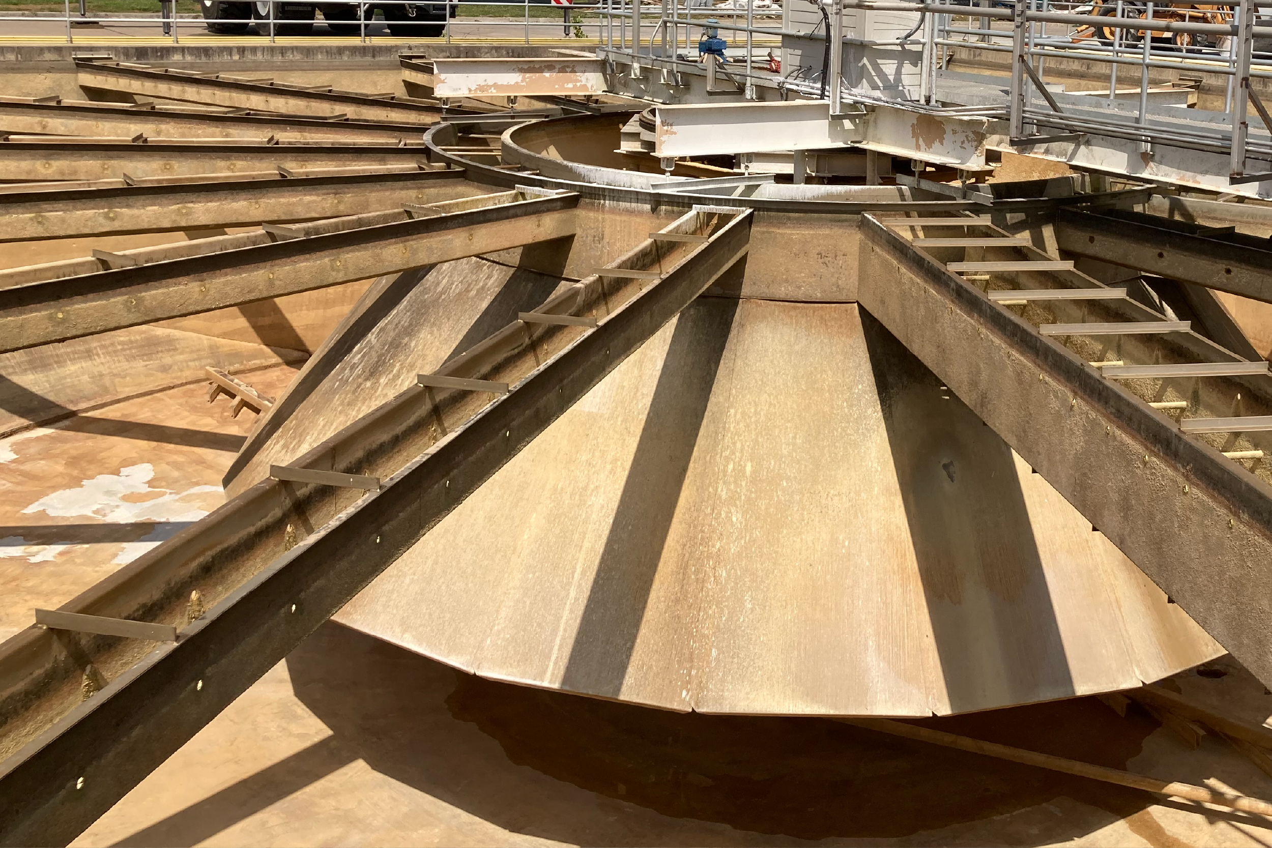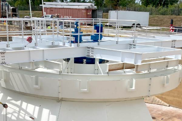 Primary Basin 3 has really started to come together. After the base was built, crews moved the spur gear into place and then capped it off with the drive assembly. The clarifier spins to remove suspended solids, and the sludge settles to the bottom, moving cleaner water to the secondary basin.