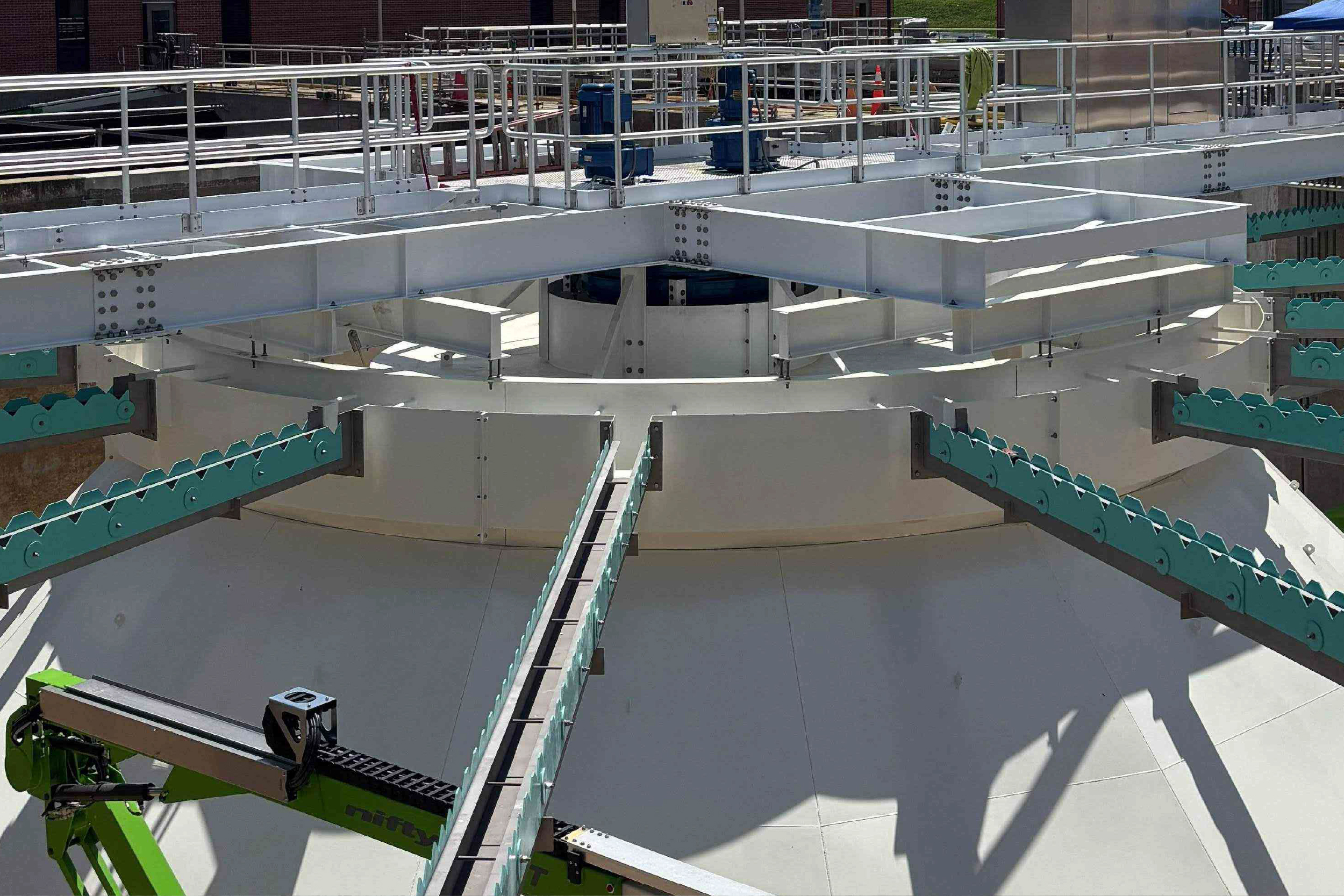 Once the drive assembly was completed, crews worked to install the bridge that spans Primary Basin 3. The team built the bridge and then moved it as a single piece over the basin. Precision was important. The bridge had to fit over the drive assembly and onto the brackets attached to the basin walls. A fraction of an inch out of place meant the bridge wouldn't fit.