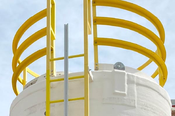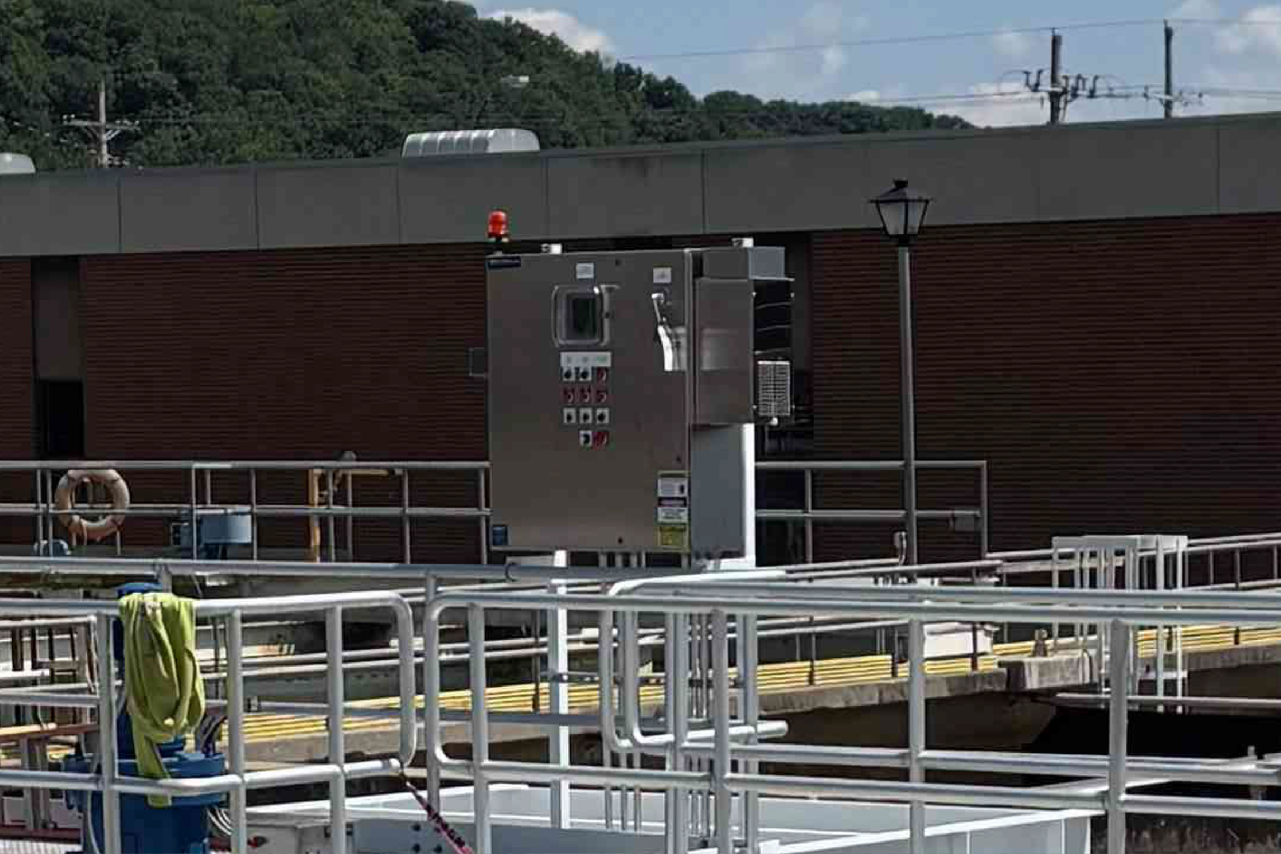 With the addition of the weirs, the clarifier in Primary Basin 3 is complete. As the solids sink to the bottom of the basin, the cleaner water rises to the top and flows into the weirs and toward the center ring. Water in the center ring is then directed into the secondary basin. The lime enclosure was installed on the bridge with lime piping connected to the dosing assembly installed inside.