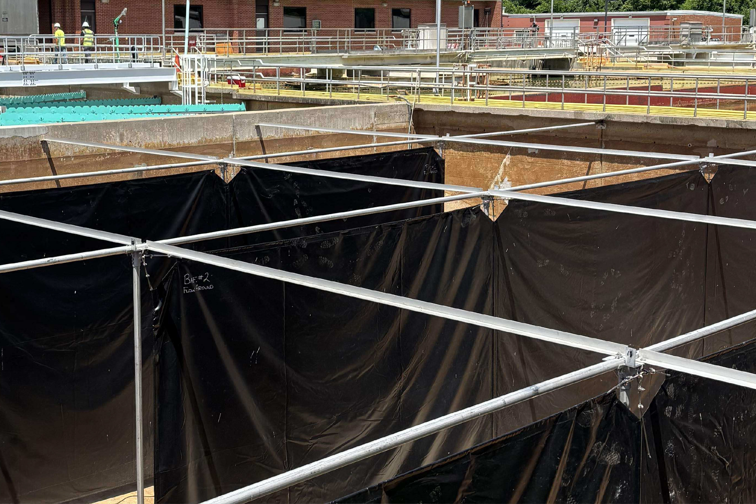 Crews began installing rods that will align the baffle curtain in Secondary Basin 3. The baffle curtain will be arranged similar to a queue for an amusement park ride. This slows the water flow, allowing more solids and sediments to settle at the bottom. Water is taken from the top to the filtration building and further treament.