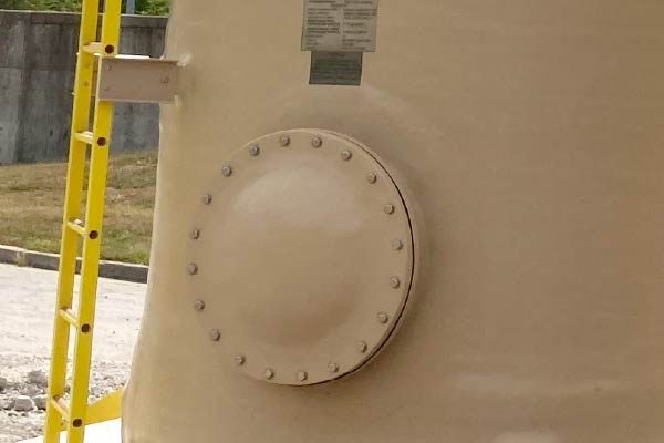 At the chemical building, the chlorine scrubber has been installed. The chlorine scrubber captures and neutralizes chlorine gas to prevent pollution. Inside, the hardware for the monorail system used to load chlorine gas into the storage area was installed.