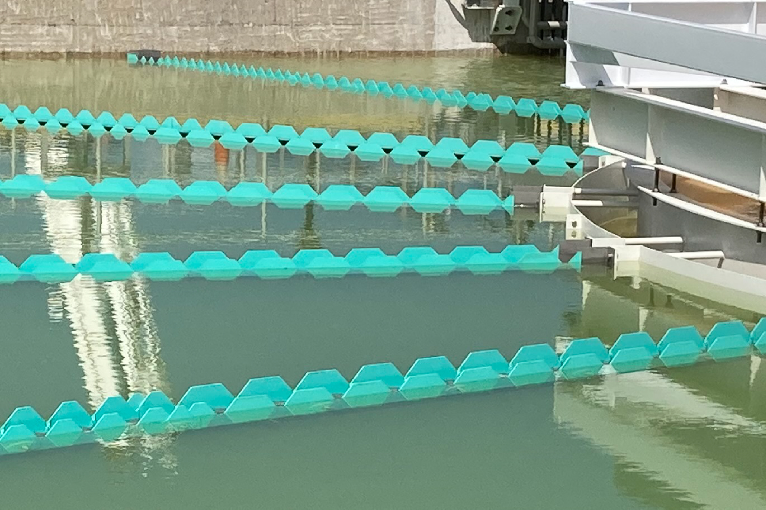 Over in Secondary Basin 3, the baffle curtains have been installed. The baffle curtain is arranged similar to a queue for an amusement park ride. This slows the water flow, allowing more solids and sediments to settle at the bottom. Water is taken from the top to the filtration building and further treatment.